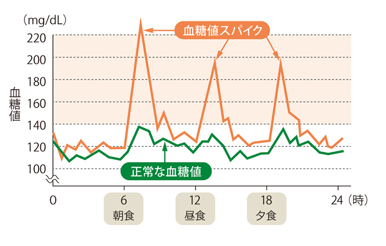 食事の取り方を考える上で気にかけておきたいのが血糖値です。血糖値とは、血液中のブドウ糖(グルコース)の濃度のことで、ブドウ糖は身体のエネルギー源です。食前・食後など生活を通して変動する血糖値。通常はこの変動の波が緩やかですが、食後の血糖値が急激に変動する状態を「血糖値スパイク(グルコーススパイク)」といいます。「スパイク」とはトゲの意味で、血糖値のグラフを見ると、まさにトゲのような形状になっています。さらに、こうした血糖値の乱高下は一時的に食後の強い眠気や疲労感として感じられることがあります。しかし、血糖値の乱高下が長く続くと血管に深刻なダメージを与え、動脈硬化が進行し、心筋梗塞や脳卒中といった大きな病気につながるリスクが高まります。